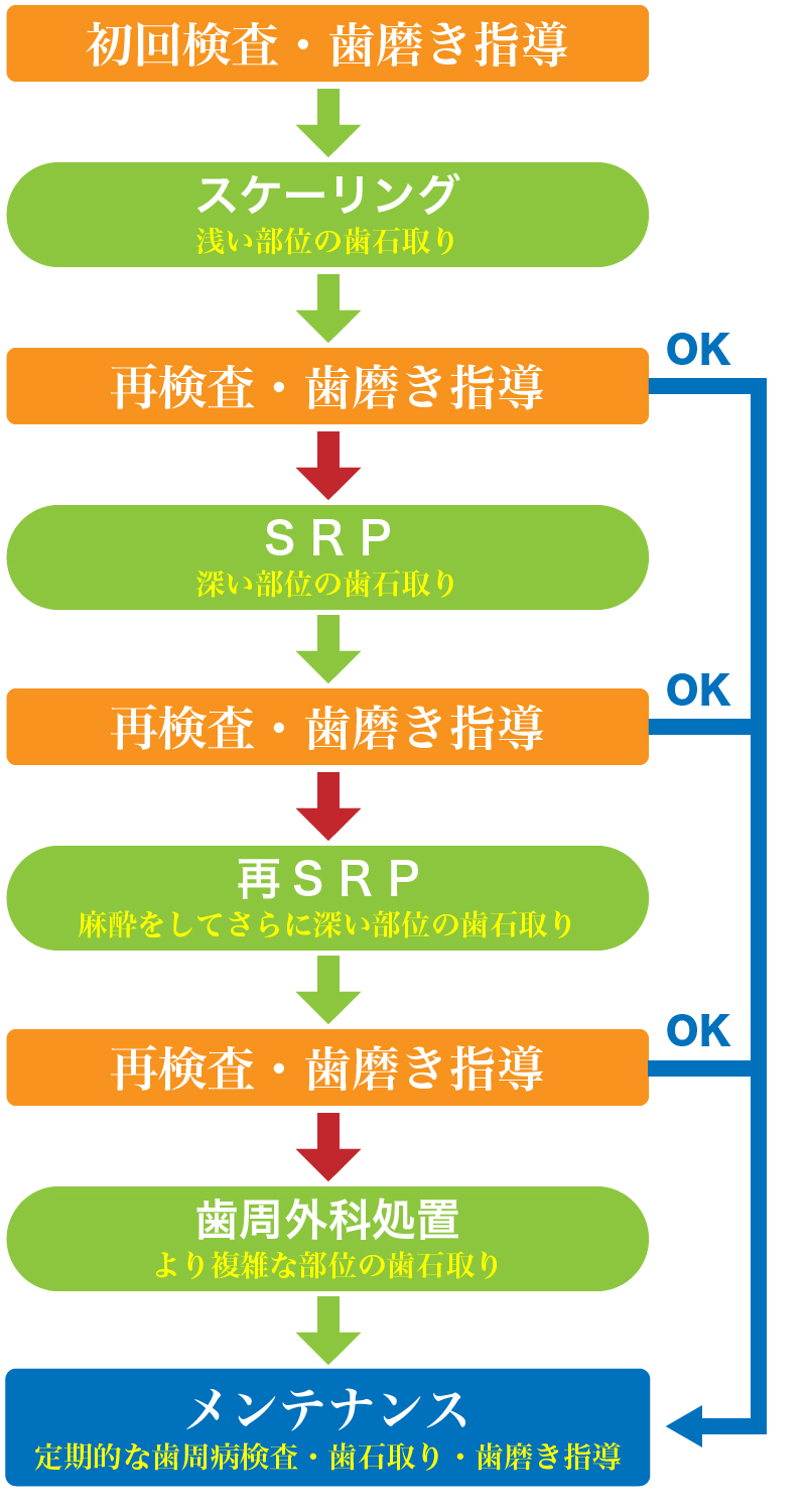 一方、磨き残しや歯石が多い場合や、歯周ポケットが深く十分に歯周病の状態が安定していないと考えられる場合、より深い部位の清掃を行っていきます。